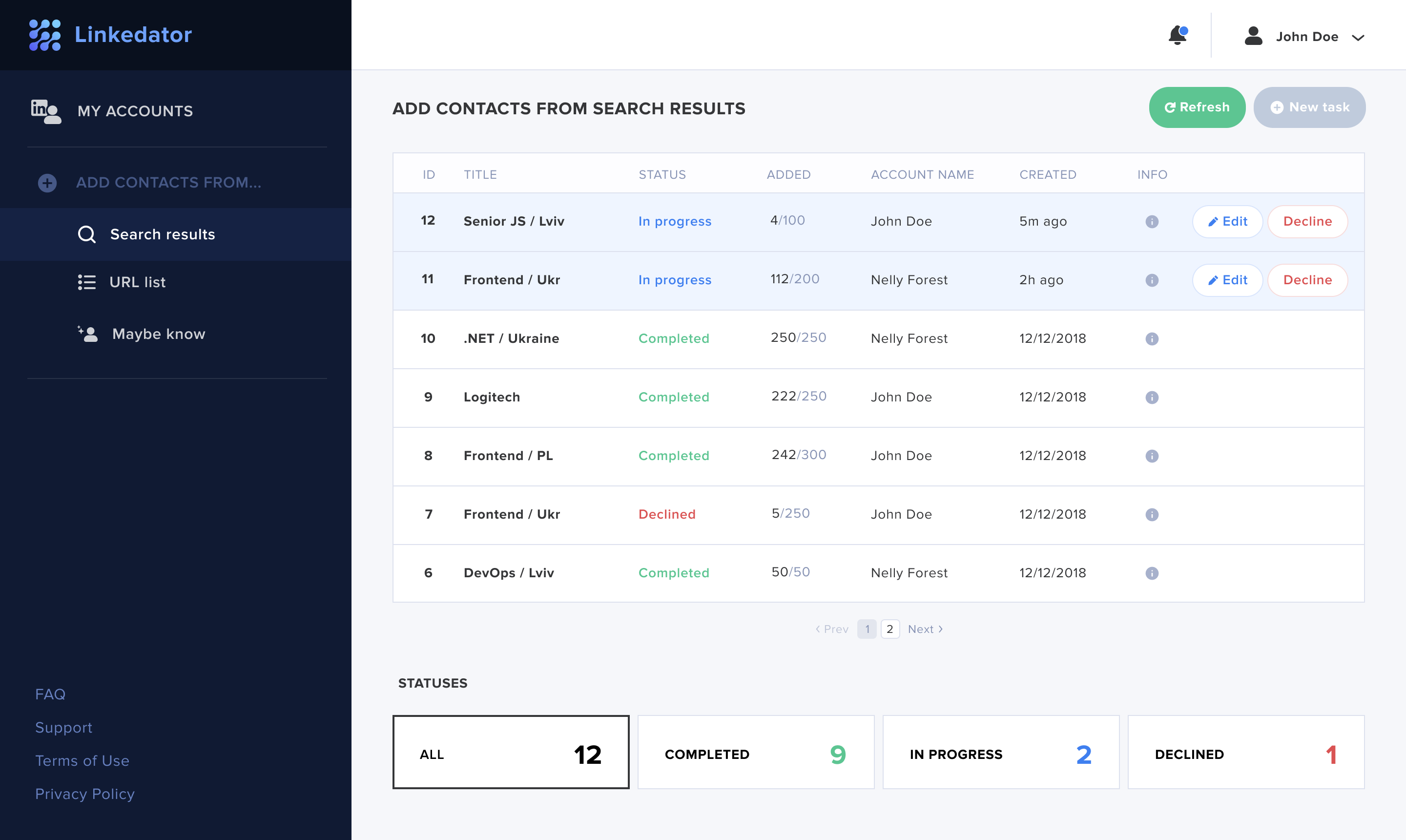 After developing the Accounts and Tasks pages, we evaluated that we had some extra time to improve them. While the cloud infrastructure was being maintained, we added the Statistics section to the Accounts page and the Statuses section to the Tasks page, which allows tasks to be filtered by their statuses.